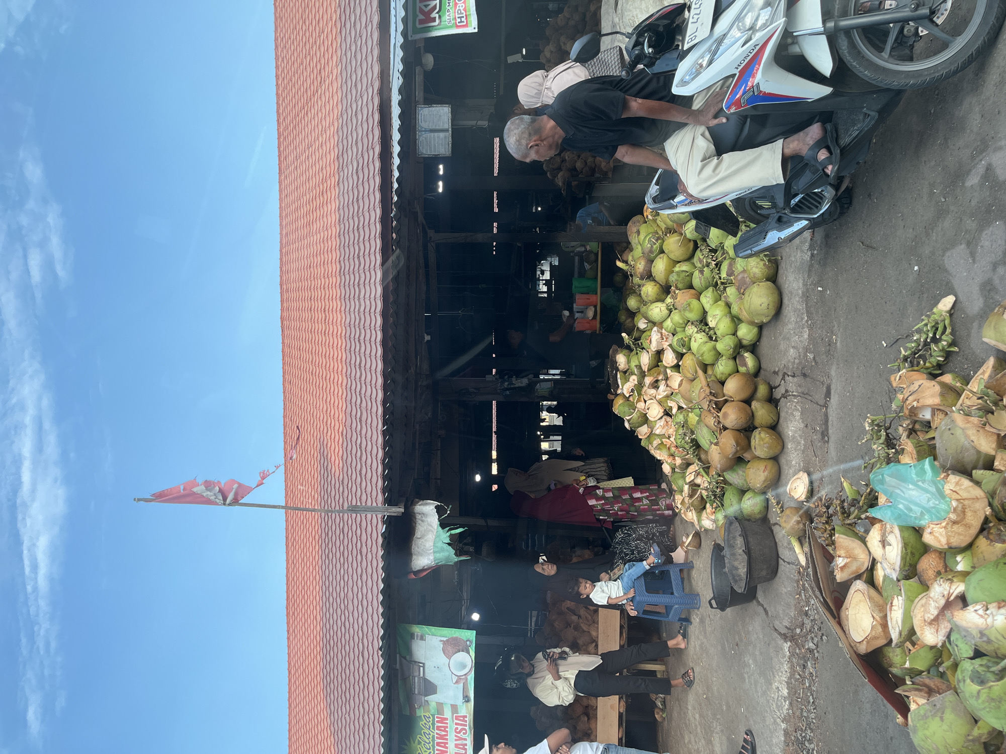 - "This image depicts an active outdoor market scene in Lhokseumawe, Indonesia, characterized by a prominent display of coconuts under a clear blue sky" by FM-NRX8S2, licensed under CC BY 4.0