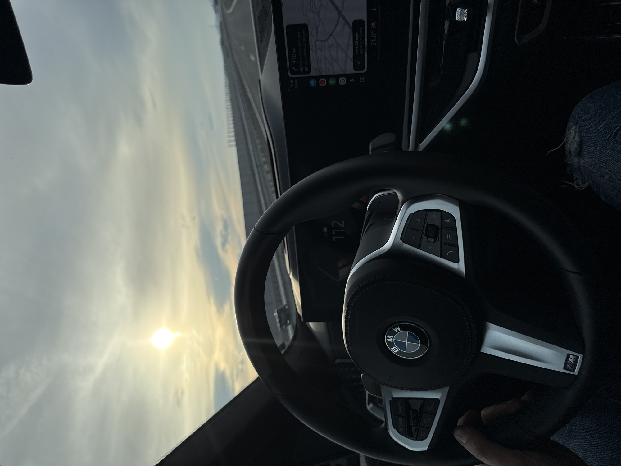 The image depicts the interior of a BMW car, focusing on the steering wheel with the BMW logo prominently displayed. The dashboard is visible, displaying navigation information with a route through the city of Mramor, Bulgaria: Montana, Волуяк. The navigation system estimates a travel time of 1 hour and 20 minutes, with a distance of 74 km. The temperature is indicated as 21.0°C. The sky is visible through the windshield, with the sun shining brightly. The driver's hand can be seen holding the steering wheel. The speedometer is visible, displaying a speed of 112 km/h. The driver is wearing denim jeans.