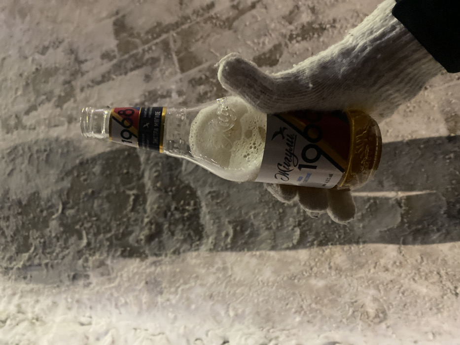 A gloved hand holds a partially consumed bottle of "Zhiguli 1968" beer. The bottle is tilted, showing frothy liquid inside. The background features a textured, icy or frosted surface, giving a cold impression. The scene is lit, with the lighting casting shadows and defining the details of the glove and the icy surface.