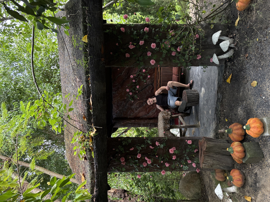 An adult male is seated within an open-sided, rustic structure resembling a gazebo or hut, located in a themed garden or attraction within Nha Trang, Vietnam