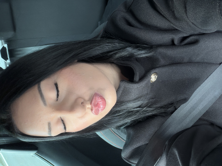 A woman with long, dark hair and light skin is depicted from the chest up, positioned inside what appears to be a vehicle. Her eyes are closed, and her lips are puckered into a "kissing" pose, enhanced with a shiny, reddish-pink lip product. She is wearing a dark, possibly black, high-collared coat or jacket with a gold-colored, ornate button visible on the right lapel area. A dark gray seatbelt crosses diagonally from her left shoulder to her right hip. The background consists of a blurry car interior, including a dark seat with red stitching on the left, a window on the far left showing a muted, indistinct outdoor view, and a dark headliner component above. The image does not contain any discernible features or landmarks to identify a specific location within the city of Marseille, France, or any other geographical area.