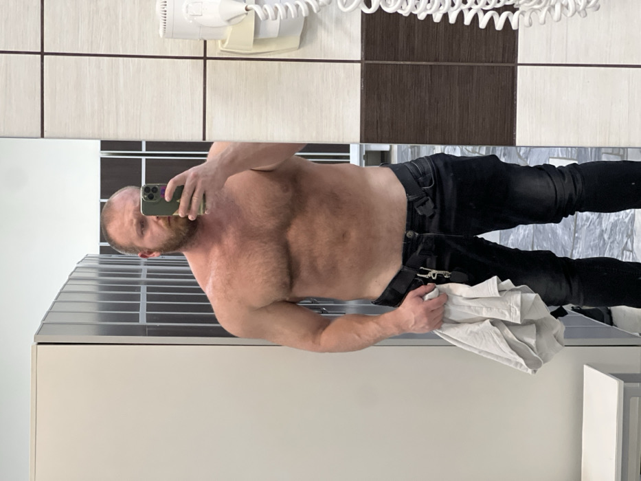 The image depicts an interior scene, specifically a changing room or locker room, located within the city of Chaikovsky, Russia. A single adult male is captured in a full-length mirror selfie. The male subject, appearing to be in his mid-thirties to forties, possesses a muscular physique, light skin, short brown hair with a receding hairline, and a full brown beard. His torso is bare, displaying prominent chest hair. He is wearing dark-colored jeans secured by a black belt, from which a metallic carabiner and a key fob are suspended on his left hip. His left hand holds a folded light-colored garment or towel. His right hand holds a light green mobile phone, which he uses to photograph his reflection. He maintains a neutral facial expression, looking directly into the phone's camera. The environment reflected in the mirror consists of a light-colored panel or locker bank on the left. To the right, a wall is tiled horizontally, featuring a top section of light beige tiles and a lower section of dark brown tiles. A white wall-mounted hairdryer with a coiled white cord is affixed to this tiled wall. In the background, a row of dark-colored lockers with vertical detailing is visible. A low, white rectangular bench or shelf is present in the lower left portion of the frame. The lighting within the room appears to be uniform artificial illumination.