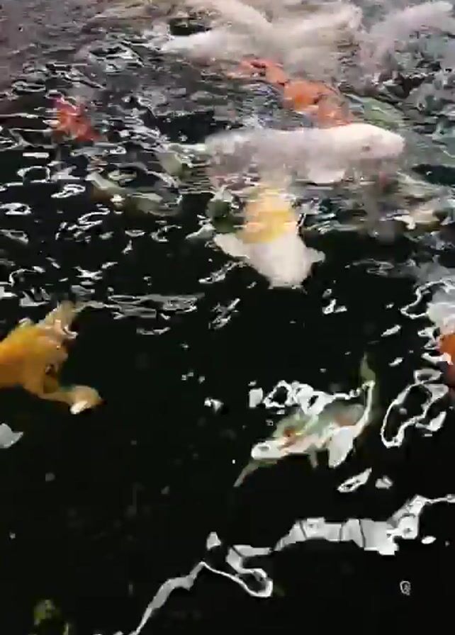 pond teeming with koi fish of varying colors. The water is dark, and the fish are swimming close to the surface, creating ripples and splashes. The koi are mostly white, orange, and gold. A small section of the pond's edge is visible at the top right corner.