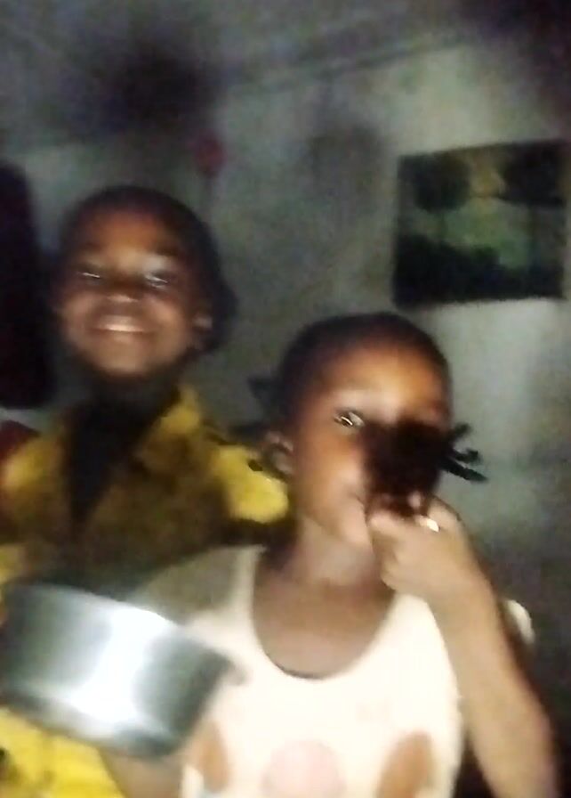 Two young girls are lying on a gray surface, possibly a floor, and looking up at the camera. The girl in the foreground is wearing a light-colored patterned shirt and has her hair in braids. She is holding a small white object, possibly a toothbrush, in her mouth. The girl in the background is wearing a yellow button-down shirt. A metal pot is visible near the top left corner of the frame. A dark object, potentially a bag or piece of clothing, is positioned above the girl in the yellow shirt. The lighting in the room appears dim. There is a small, square object with a dark design on it to the right of the girls.