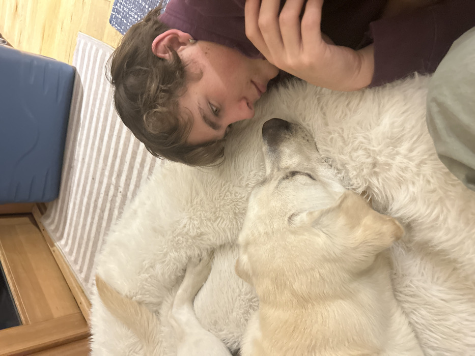 The image depicts an indoor domestic scene in Squamish, Canada. A young individual, with wavy brown hair and wearing a dark maroon long-sleeved shirt and an earring in the left ear, is lying prone on a white, shaggy rug. The individual's face is positioned closely, looking towards a sleeping, light cream-colored Labrador Retriever, whose eyes are closed and head rests on the rug. Behind the Labrador, a second white, shaggy-haired dog is partially visible, with its tan-tipped tail and hindquarters also resting on the rug. The background features a light wood floor, a striped rug, a blue storage container, and a wooden door frame.