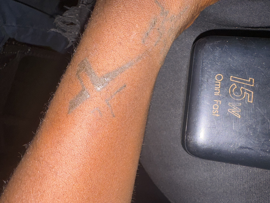 A human forearm with medium brown skin and visible hair follicles is depicted, resting on a dark, rectangular electronic device. A faded, greyish-black tattoo is visible on the inner aspect of the forearm, forming a stylized, angular design that resembles a "7" or a geometric pattern. The electronic device is a dark grey or black power bank with visible scuff marks, displaying the text "15W Omni Fast" in orange lettering, oriented upside down relative to the forearm. The background is dark and indistinct, appearing to be fabric, possibly torn denim visible in the upper right. The scene is located in Adankolo, Nigeria.