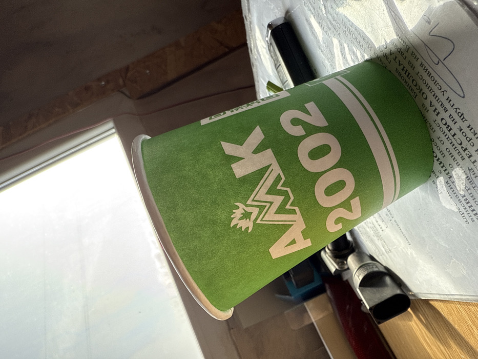 The scene is an interior view, likely a desk or table surface, located in Hrishteni, Bulgaria. The primary subject is a green paper cup, prominently positioned in the center. The cup features a white logo with a stylized 'M' topped by a crown or flame, above which are the Cyrillic letters "АМК" and the number "2002". Two white horizontal stripes encircle the lower portion of the cup, and its rim is white. The cup rests on light-colored documents, which display visible Cyrillic text, including words such as "БАНКОВАТА", "ОКОЛНАТА", "МИНИСТЕРСТВО НА", and "УСЛОВИЯ". To the right of the cup, a black object resembling a car key fob or remote control with silver accents and a small green detail is visible. To the left of the cup, a dark, angular object with a cylindrical component, possibly part of an electronic device or tool, is present. Further left, indistinct objects include what appears to be a blue container and a reddish item. Bright light originates from a window or light source positioned in the upper left quadrant of the image, creating highlights and shadows within the scene. The upper right background consists of a dark, textured surface, likely a wall or furniture. No individuals are depicted, and no specific actions or interactions are occurring. The environment suggests an indoor setting, possibly an office or personal workspace.