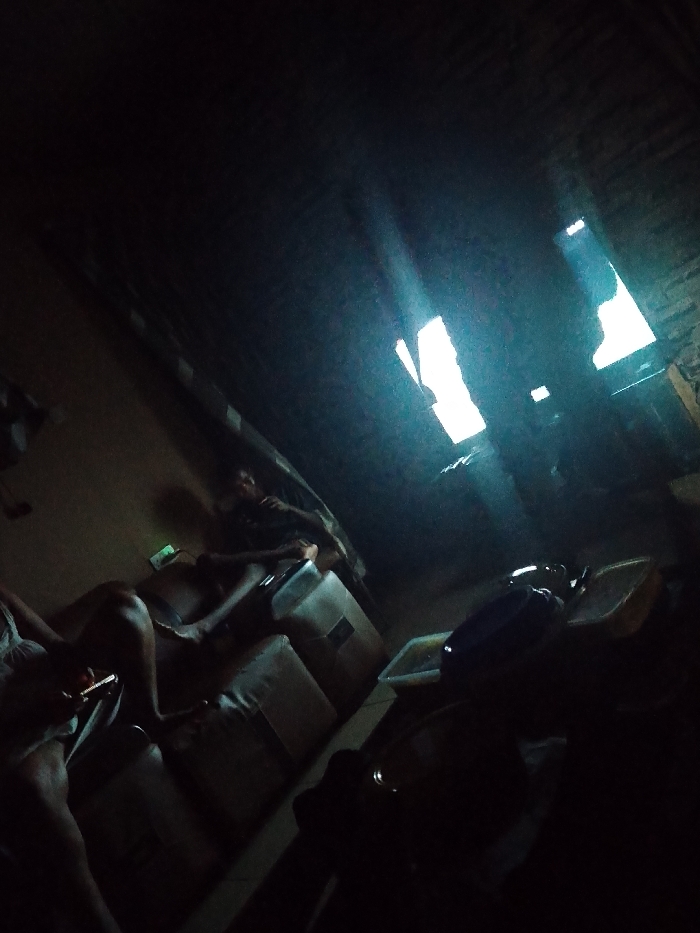 In a dimly lit, possibly indoor space, at least two individuals are visible. One appears to be reclining on what could be a couch or stack of boxes, while the other is partially seen in the foreground, holding an object. Light streams in through openings in the ceiling, creating stark contrast. There are also objects resembling dishes in the foreground. The overall scene has a casual and possibly makeshift atmosphere.