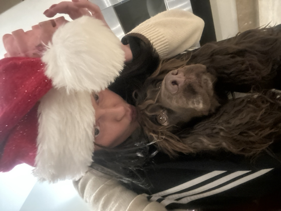 A person wearing a Santa hat with a white pom-pom is positioned close to the camera. A brown spaniel-type dog snuggles into the person's side. The person is also wearing a beige sweater, with black clothing and white stripes visible underneath. The image is taken from a low angle, looking upwards at the subjects. The background is slightly blurred, suggesting an indoor setting.