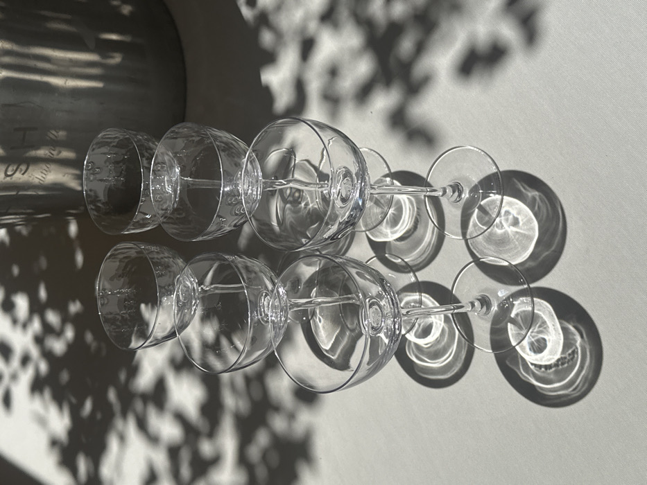 - "Six empty wine glasses sit in two rows, casting intricate shadows from the stems and bases onto a white surface" by FM-tdNvZ2, licensed under CC BY 4.0