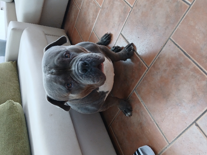 The image depicts an indoor residential setting in San Bartolomé de Tirajana, Spain. A grey American Bully type dog, featuring a white chest and dark eyes, is centrally positioned in the foreground, seated on all four paws and facing directly towards the viewer with its mouth slightly open. The floor consists of square, terracotta-colored ceramic tiles with dark grey grout lines. In the background, a light-colored sofa occupies the left and center, featuring two olive-green throw pillows. A second, similar light-colored sofa section is visible to the right, behind which a light grey cylindrical pot stands. A white sandal with black stripes is partially visible on the tiled floor in the lower-left corner. No human subjects are present; no explicit actions or interactions beyond the dog's pose are depicted.