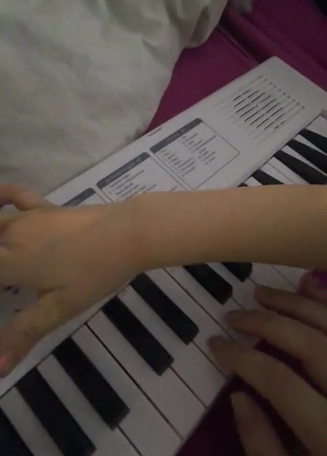 A person's hands play a white electronic keyboard with black keys. The keyboard has labeled buttons and text in Russian. The keyboard sits on a purple surface next to a white pillow or bedding. The hands move rapidly across the keys as the person plays.