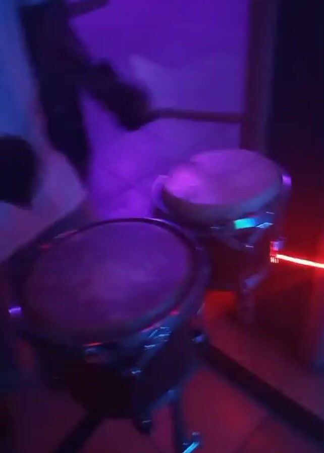 A person wearing a white T-shirt is playing a pair of timbales with drumsticks in a room lit with blue and red lights. The timbales are mounted on stands. The drummer is standing behind the drums, moving their arms to strike the drumheads. The background shows parts of a bar or performance area.