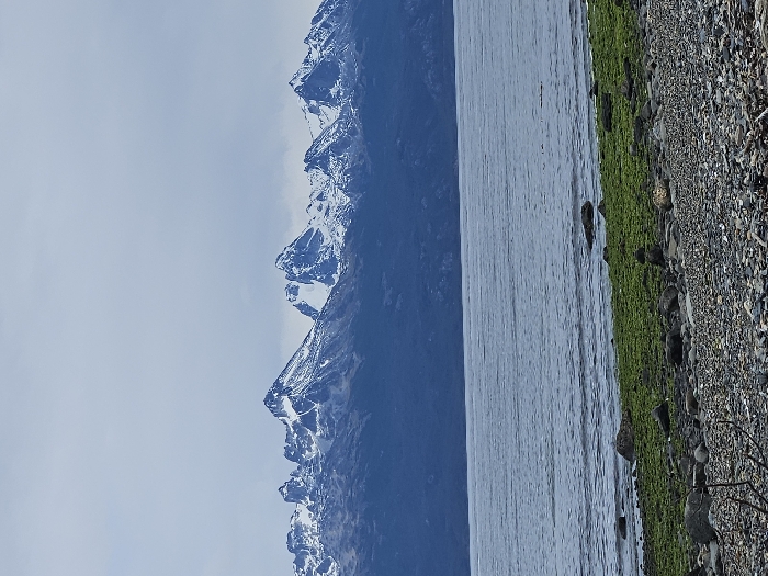 Snow-capped mountains reach into a pale blue sky. A body of water reflects light, suggesting a calm surface. The shoreline is thick with green foliage and a variety of pebbles and rocks. A few tree branches are visible on the edge.