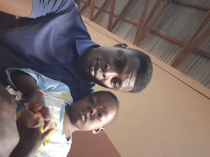 A man holds a young child. The man wears a blue collared shirt. The child wears a light blue shirt with yellow detailing and has a pink bracelet. They are indoors. The background includes a sloped ceiling made of corrugated metal and wooden beams, and a plain tan-colored wall. The photograph appears to be taken from a low angle.