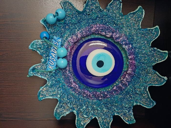 The image features a decorative, glitter-textured object against a dark, vertically-grained background. The object is primarily turquoise blue with iridescent flecks, shaped like an irregular sun or star with approximately 16-18 wavy points. A prominent, round glass evil eye (Nazar) bead is centrally affixed, consisting of concentric circles in dark blue, white, light blue, and a central dark blue pupil. An intermediate ring of textured purple and pink glitter surrounds the central eye. On the upper right quadrant of the object, a small, light blue plaque reads "KUŞADASI" in white capital letters. Adjacent to this plaque are two light blue spherical beads, with an additional cluster of three light blue spherical beads and one dark blue spherical bead located further to the right, some appearing to be strung. No people are present, and no actions or interactions are depicted. The specific location in the city of Pleven, Bulgaria, cannot be determined from the visual content of the image.