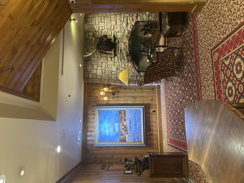 The image showcases an interior with rustic design elements. A stone fireplace with a mounted moose head sits atop a wall. Below, a painting hangs above a wooden console table with decorative sculpture. A leopard-print chair rests near the fireplace. A patterned rug in red and beige covers the floor, leading to a wooden table. The walls are wood paneling, and the ceiling is slanted, with wood planks and recessed lighting.