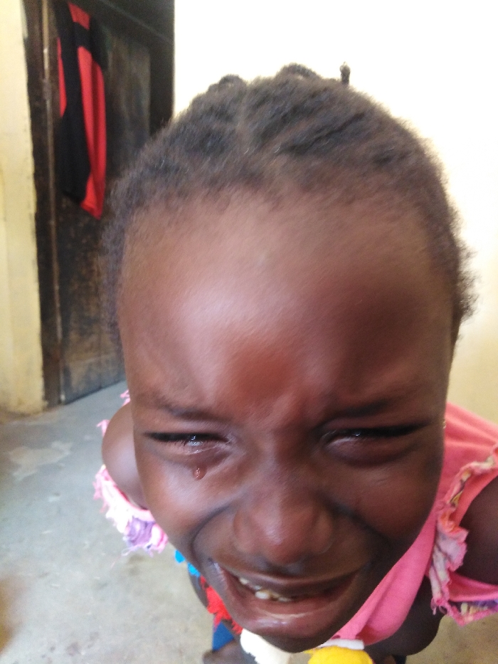 A close-up, high-angle portrait shows a young child with dark skin and dark, braided hair crying in an indoor setting in Yelwa, Nigeria