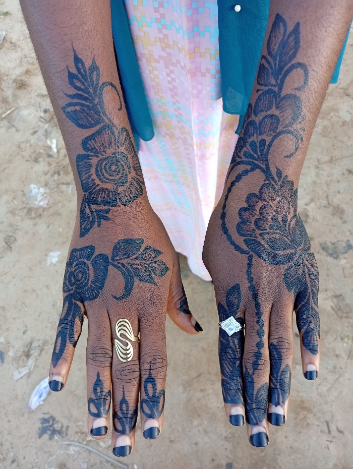- "Two brown hands are adorned with intricate black henna designs featuring floral motifs" by FM-MqKs82, licensed under CC BY 4.0