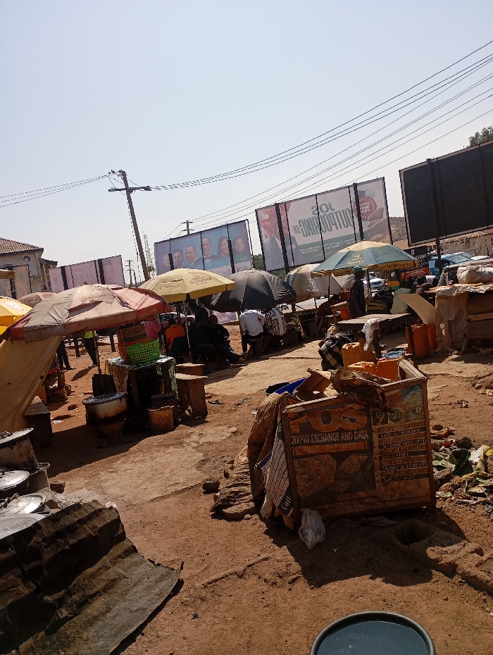 This image captures an outdoor market scene in Jos, Nigeria, characterized by unpaved ground, makeshift stalls, and numerous individuals under a bright, clear sky. The ground consists of reddish-brown compacted earth, uneven in texture, with scattered debris including plastic bags and other refuse. Overhead, power lines crisscross, originating from a wooden utility pole positioned in the upper left background. In the mid-ground, a series of market stalls are set up, each featuring a large umbrella for shade. Umbrella colors vary, including yellow, dark blue/black, and light brown/reddish. Visible among the stalls are various containers, cooking pots, metallic bowls, plastic jerrycans (some orange), and wooden stools. Multiple individuals, estimated to be at least a dozen, are present within the market area, largely congregated around the stalls. Some are seated on stools, others stand. Specific actions are not definitively identifiable beyond general market presence. In the background, several large billboards are visible. Two prominent billboards display images of multiple individuals, likely political figures, and text, with legible portions including "JOS" and "JOS OUTDOOR". Faintly visible vehicles are in the distant background beyond the billboards. In the immediate foreground, a prominent wooden kiosk, oriented slightly clockwise, features painted advertisements for "CRYPTO EXCHANGE AND DATA" and "90 MOBILE" services, with text indicating "BUY & SELL MONEY," "DEPOSIT & WITHDRAW," and other mobile-related transactions. The kiosk appears weathered and is partially covered with fabric. A blue bucket or container is visible in the lower right foreground.