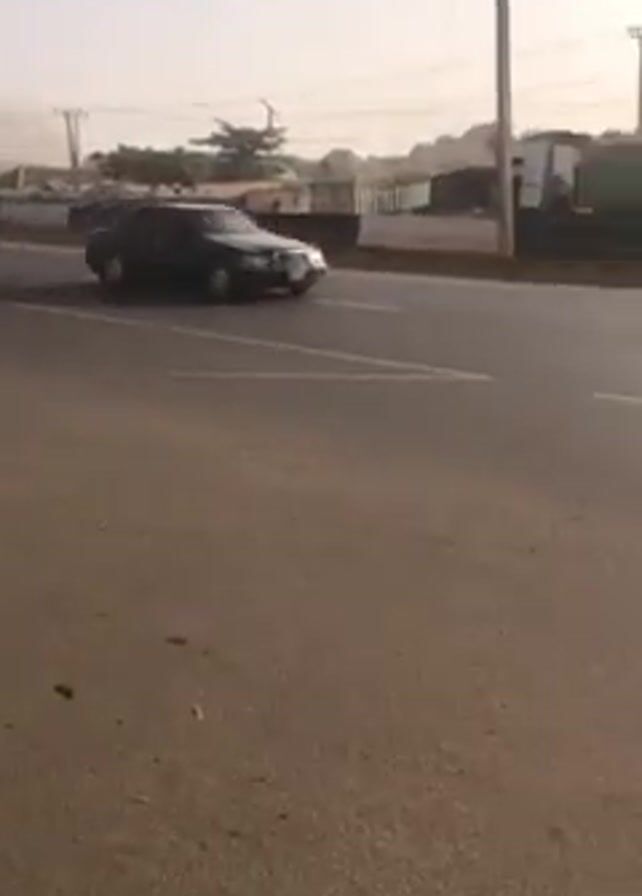 dark-colored sedan speeding down a road with a median barrier, kicking up dust. The car passes by, and then a yellow auto rickshaw, also known as a "keke," drives in the same direction. The video then shows three people, two men and one woman, standing on the side of the road, looking in the direction the vehicles went. The surrounding environment includes buildings, power lines, and other vehicles in the distance. The sky is overcast, contributing to a somewhat hazy view of the scene.