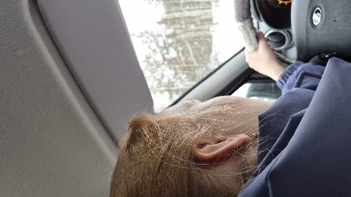 The image depicts the interior of a vehicle, observed from a forward-facing passenger perspective, looking towards the driver and the road ahead. **Location:** The specific location within Garevaya, Russia, is not discernible from the visual evidence. The exterior environment suggests a snowy, wooded area, characteristic of a rural or exurban setting. **People:** One individual is visible, presumed to be the driver, observed from the rear-right side. This person has light brown hair, which appears to be pulled back or styled. A gold-colored, circular earring is present in their visible right ear. The individual is wearing a navy blue garment, possibly a jacket or shirt, with a structured collar and ribbed cuffs on the visible right sleeve. **Objects:** * **Vehicle Interior:** The vehicle's headliner is grey and textured. A grey sun visor is visible in the raised position. The dashboard or instrument panel features an orange-lit display to the right of the steering column. * **Steering Wheel:** A black steering wheel is present, featuring a silver Lada brand emblem in its center. The right portion of the steering wheel is covered by a grey, textured, possibly fabric, material. * **Hand:** The driver's right hand is positioned on the steering wheel, specifically on the part with the grey covering. **Actions:** The individual's hand position on the steering wheel indicates they are operating or preparing to operate the vehicle. **Environment (Exterior):** Visible through the windshield and the side window is a landscape dominated by snow-covered ground and numerous bare trees, consistent with a winter forest environment. The sky appears overcast.