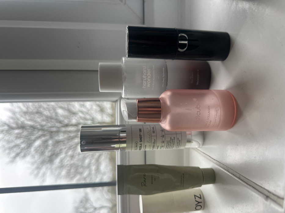 The scene depicts an interior setting on a white windowsill, located in Wealden, United Kingdom. Six cosmetic or skincare products are arranged in a line. From left to right: a partial white cylindrical container with visible lettering "OYZ"; an olive green tube with a bottom cap, labeled "Rare," "WOODY," and "ANDROGRAPHIS CALMING BALM"; a tall, slender white bottle with a silver pump dispenser, labeled "NEEDLE SHOT™ 100" and "50 mL"; a translucent pink bottle with a rose-gold pump, labeled "medicube" and "TRIPLE COLLAGEN SERUM"; a clear bottle with a white cap, containing liquid exhibiting a dark-to-light gradient, labeled "haruharu wonder® Black Rice Hyaluronic Toner," "Ultra Deep Technology," and "150 mL (5.07 fl. oz.)"; and a black cylindrical container featuring a silver "CD" logo. The background, viewed through a window, displays a blurred outdoor environment with bare tree branches against an overcast sky. No individuals are present.