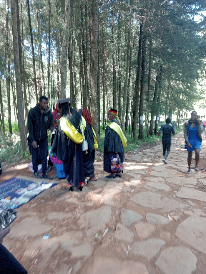 The scene is set outdoors within the city of Waseges ward, Kenya, characterized by a dense arrangement of numerous tall, slender trees with dark green foliage lining a reddish-brown dirt path embedded with irregular flat stones. Natural daylight illuminates the area. In the mid-ground, a group of approximately five to six individuals is present on the left side of the path. One dark-complexioned male, wearing a dark hooded sweatshirt and dark trousers, stands facing right, appearing to interact with a person in academic regalia. To his right, three individuals are primarily visible, all wearing black academic gowns with yellow stoles or hoods. One female, viewed from the back, wears a black mortarboard cap. Another individual in regalia, with a distinctive red, yellow, and black patterned head wrap, carries a multi-colored patterned bag (purple, orange, green, black) on their left arm, facing towards the right. A blue and pink bucket is positioned on the ground near this group, alongside a blue mat spread on the reddish-brown soil, on which several white items are arranged. Further down the path in the background, two males are walking. One, wearing a dark long-sleeved shirt and dark trousers, walks away from the camera. The other, wearing a dark top and light blue shorts, walks towards the camera, holding a mobile phone to his right ear and smiling. The far background reveals more blurred figures and trees.