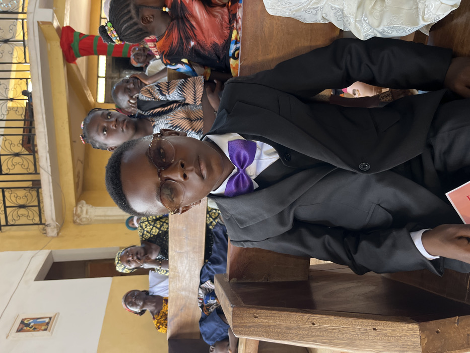 The image depicts an indoor gathering space, presented as being located in Kuru Karama, Nigeria. The primary subject is a young Black male, approximately 8-12 years old, positioned in the foreground and center, seated upright on a dark wooden pew. He is wearing a black three-piece suit, a white collared shirt, and a purple satin bow tie. His hair is cut short, and he wears round, light-tinted glasses. He looks directly forward with a neutral expression. His right hand holds a small, light-colored booklet with red text. In the background, behind the boy, are several other individuals, primarily women and children, also seated on similar wooden pews. Many are Black individuals. To the boy's left, a child is lying horizontally across a wooden pew. Directly behind the boy, a young Black girl with beaded braids looks towards the right. Other women, some wearing head wraps and patterned clothing, are visible further back, appearing to observe something out of frame. The environment features light yellow-painted walls, an ornate dark wooden balcony or upper level with a metal railing, and a religious icon depicting a Madonna and Child figure affixed to the upper left wall. A decorative element, consisting of red and green fabric, is wrapped around a pillar in the deeper background to the right. The seating consists of sturdy, dark wooden pews. The scene suggests a formal assembly, likely in a church or community hall.