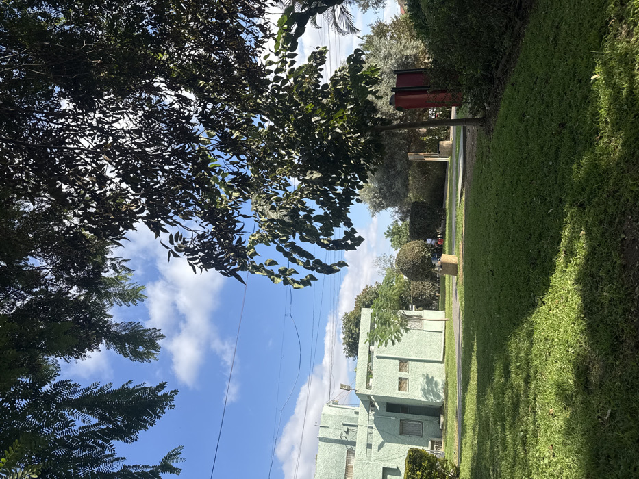 The image depicts an outdoor scene in Nordia, Israel, under a clear blue sky with scattered white cumulus clouds. Dark green foliage from two large trees frames the upper left and right portions of the image. Multiple utility lines are visible stretched horizontally across the sky in the mid-ground. The foreground is dominated by a manicured, vibrant green lawn, displaying shadows from overhead trees, indicative of direct sunlight. A paved pathway is visible curving through the grass, extending into the mid-ground. On the left side of the mid-ground, a light mint-green building complex with a textured, stucco-like finish is prominent. This structure features multiple angular sections, flat roofs, and small, horizontally-oriented windows, some with security bars. A satellite dish or antenna is mounted on the roof of one section. Adjacent to it, a smaller, single-story structure of identical color and finish stands, with a small tree planted directly in front. In the right mid-ground, a slender tree with dark green leaves is present. To its right, partially obscured by dense green bushes, a dark red, vertical rectangular structure is visible. Two short, light-colored cylindrical bollards or concrete planters are positioned along the paved pathway in the mid-ground. Further back, a small, circular, manicured bush is observed. In the distant background, amidst various trees and hedges, two indistinct human figures are partially visible. One figure appears to be wearing a red top. They are situated near a light-colored rectangular object, possibly a bench or table. The scene is well-lit by natural sunlight, casting discernible shadows on the ground.