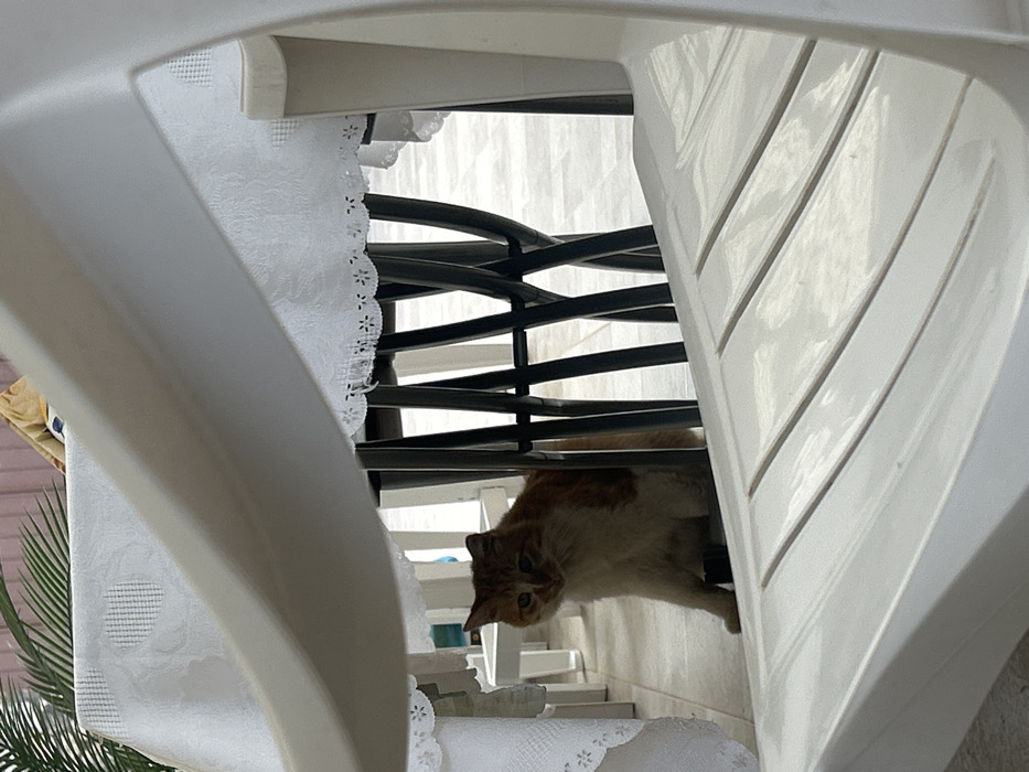 The image captures an adult domestic cat in Karmiel, Israel, positioned within an outdoor or semi-outdoor patio environment. In the foreground, the top and seat of a white plastic chair are prominent, partially framing the scene. Behind this chair, an orange and white cat is visible, seated or crouching directly under a table. The cat faces forward, looking towards the viewer. The table above the cat is draped with a white tablecloth featuring an embossed pattern and a scalloped, embroidered edge. Beneath the tablecloth, dark-colored, possibly metal, table legs with a vertical design are discernible. To the left of the cat, a portion of another white chair is visible. The ground surface consists of light-colored square tiles. In the upper left background, green foliage, specifically a palm frond, is present. The scene is illuminated by natural light. No human subjects are present in the frame.
