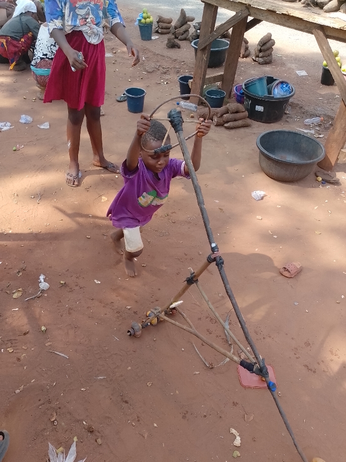 The scene depicts an outdoor setting in Ejule, Nigeria, characterized by reddish-brown dirt ground with scattered debris including plastic bags and leaves. Direct sunlight indicates daytime conditions. In the foreground, a young male child with short hair and dark skin wears a purple t-shirt and light-colored shorts, operating a large, homemade wheeled toy. The toy is constructed from dark wooden sticks, plastic piping, and black tape, featuring a plastic bottle integrated into the upper structure and wooden spool-like wheels on a triangular base. The child, barefoot, leans forward, gripping the toy's upper handles with both hands, suggesting active movement. Behind him, slightly to the left, a taller female child or young individual with dark skin stands wearing a multi-colored patterned top and a red skirt. She wears light-colored sandals on her visible right foot and holds a small white object in her left hand. Further left and partially obscured, an adult figure is visible, wearing a white head covering and patterned clothing, in a crouched or seated position. The background reveals elements of an informal market or roadside stall. Multiple conical piles of yams are arranged on the ground. Various plastic buckets and basins in shades of blue, black, and green are scattered throughout the area; one blue bucket contains green spherical fruits. A rudimentary wooden structure, possibly part of a stall, is visible on the right. A single brown sandal rests on the ground near this structure.