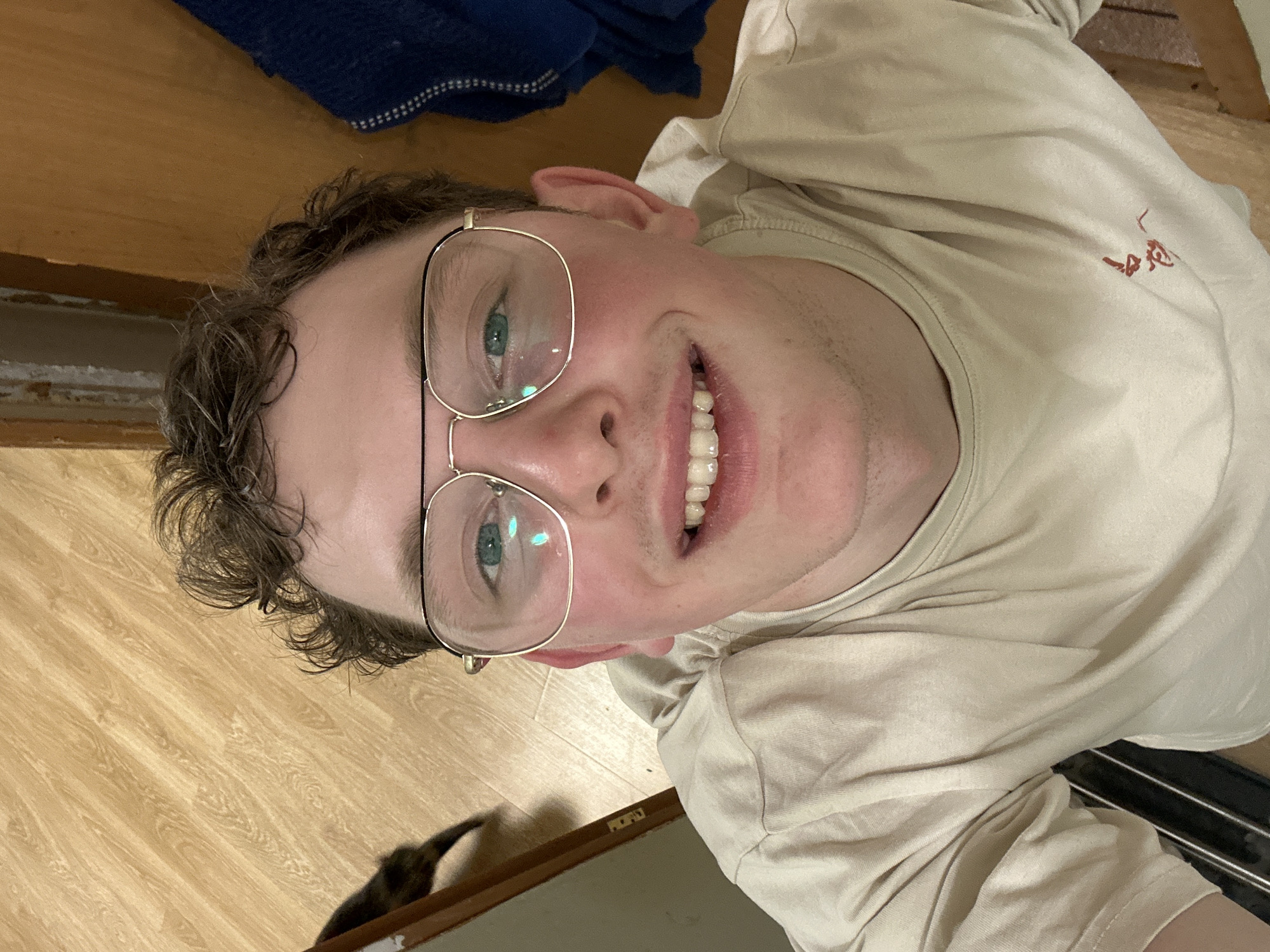 The image displays a young adult male with light skin, short curly brown hair, and blue eyes, positioned centrally, looking directly at the camera with a smile that reveals his upper teeth. He is wearing thin, gold-framed rectangular eyeglasses, which show light reflections in the lenses. His attire consists of a light beige, short-sleeved t-shirt featuring a small reddish-brown stylized logo on the left chest area. The scene is an indoor setting, viewed from a low angle looking upwards. The background to the upper left features a light brown wooden surface, possibly a floor or wall, constructed from horizontal planks. Partially visible next to a vertical wooden doorframe on the far left is a blurry, dark-colored animal, consistent with a cat. The background to the upper right includes a vertical section of a darker brown wooden panel or doorframe, adjacent to which hangs a dark blue towel or fabric with a visible textured edge. No specific visual identifiers within the image, such as landmarks, street signs, or unique architectural features, are present to confirm the location as Saint Petersburg, Russia. The environment appears to be a generic interior space.