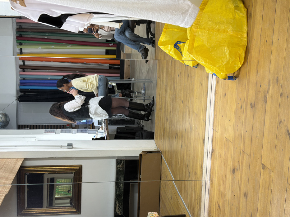 The image depicts an interior scene, identified as a studio in Paris, France. A large, floor-to-ceiling mirror dominates the left and central foreground, reflecting a light brown wooden floor with visible grain and sections of the room. In the lower right, two large, crinkled yellow bags with blue handles rest on the floor. In the midground, a woman with long, dark curly hair, wearing a white collared shirt, dark vest, black mini-skirt, sheer dark tights, and black knee-high boots, stands facing another woman. This standing woman is actively applying makeup to the face of the second woman, who has dark skin and dark hair tied in a ponytail. The second woman is seated on a tall chrome bar stool, wearing a light yellow long-sleeved top and blue jeans, looking towards the makeup artist. Behind the two women, a white wall is visible, lined vertically with numerous rolled paper backdrops in various colors, including blue, green, pink, orange, red, and black. A table with various makeup products and bottles is situated between the two women. A silver disco ball hangs from the ceiling in the upper central area. To the far right, in the reflection of the mirror and partially obscured by a white garment hanging on a rack, a third individual is seated on a chair, holding a smartphone. This person appears to be observing or capturing the scene. The mirror's left side also reflects a window with green foliage visible outside, positioned above a golden-framed mirror hanging on a white wall.