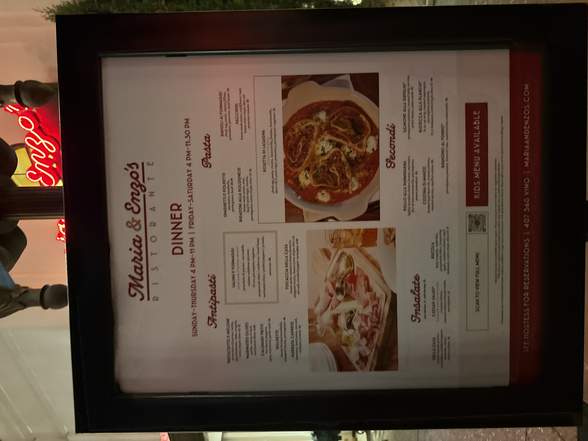 Here is a description of the image: The image shows a framed menu for Maria & Enzo's Ristorante. The menu is displayed behind glass or clear plastic. The menu displays the restaurant name prominently at the top, followed by "DINNER" and hours of operation: Sunday-Thursday 4 PM-11 PM; Friday-Saturday 4 PM-11:30 PM. The menu is divided into sections: Antipasti, Pasta, Insalate, and Secondi. The restaurant is located in Lake Buena Vista, Florida, United States.