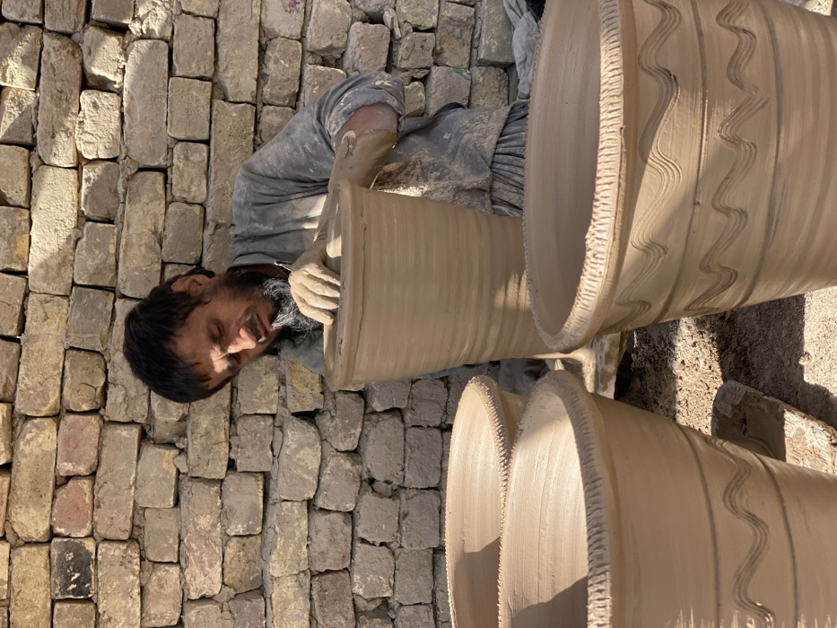 A male artisan is depicted performing pottery work in an outdoor setting in Kandahar, Afghanistan