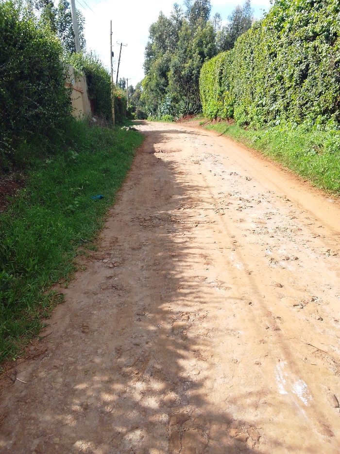 The image displays an unpaved, reddish-brown dirt road in Ndeiya, Kenya, extending into the distance under bright daylight