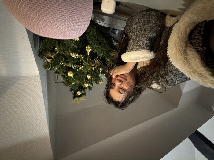 A woman in a gray coat with a fur-trimmed hood rests her head on her hand beside a small, decorated Christmas tree. The tree is adorned with gold ornaments and tinsel. A pink, knitted object is visible above the tree. The background consists of white walls and a hint of dark trim. The image is rotated, giving a tilted perspective.
