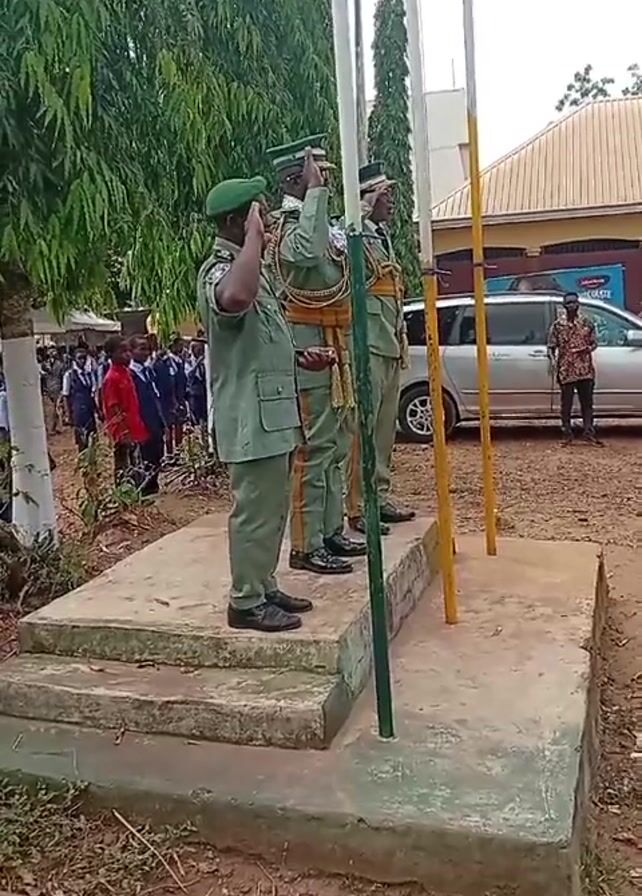 three men in green uniforms standing on a concrete platform, saluting. They are standing in front of three flag poles. Behind them is a group of children in school uniforms. In the background is a building and a silver van. The ground is covered in dirt and there are some trees nearby. The video appears to be taken at a school or a similar institution. The men appear to be in a position of authority. The atmosphere seems formal.