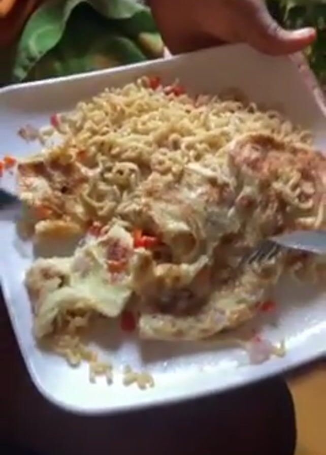 person or persons using two forks to divide a dish of noodles and what appears to be an omelet or fried egg on a white square plate. The noodles are light brown and interspersed with diced red and white vegetables. The omelet has a slightly browned surface and contains similar diced vegetables. The person holding the plate has dark skin. In the background, there is a green patterned fabric and a glimpse of a wooden surface.
