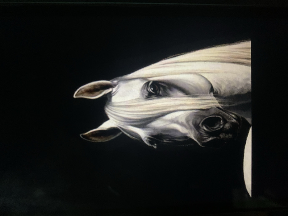 - "This image presents a detailed, head-and-neck portrait of a light-colored horse, likely an Arabian breed, set against a solid, dark black background" by FM-q7EDs2, licensed under CC BY 4.0