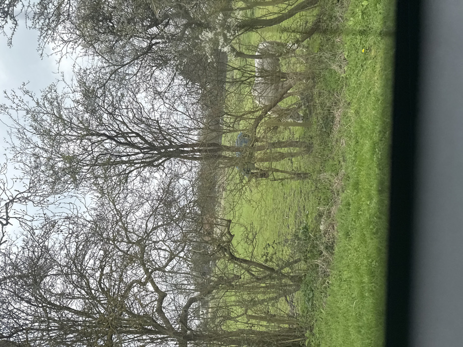This image depicts an outdoor, rural landscape, notionally located in Denford, United Kingdom, under an overcast sky. The view is framed from a low perspective, potentially from inside a vehicle, indicated by a dark horizontal strip at the bottom of the frame. The immediate foreground displays vibrant green grass with minimal yellow floral elements. A dense line of unfoliated deciduous trees and shrubs, characterized by bare, gnarled branches, forms a significant visual barrier across the midground. Behind this vegetation, an expansive green pasture is visible. A wire fence runs horizontally through the tree line. Within the pasture, two light-colored quadrupeds are partially obscured by the trees and fence. On the right, a white or light grey sheep is observed with its head lowered, facing left, actively grazing. Further left and deeper into the field, another light-colored animal, possibly a donkey or pony, is also seen with its head down, largely hidden by the dense tree cover. A blue tarpaulin or covering is situated on the ground or over an object within the tree line in the mid-left portion of the field. The background consists of a uniform light grey, cloud-covered sky, with distant, indistinct tree lines and faint structural elements on the horizon. No human subjects are present in the scene.