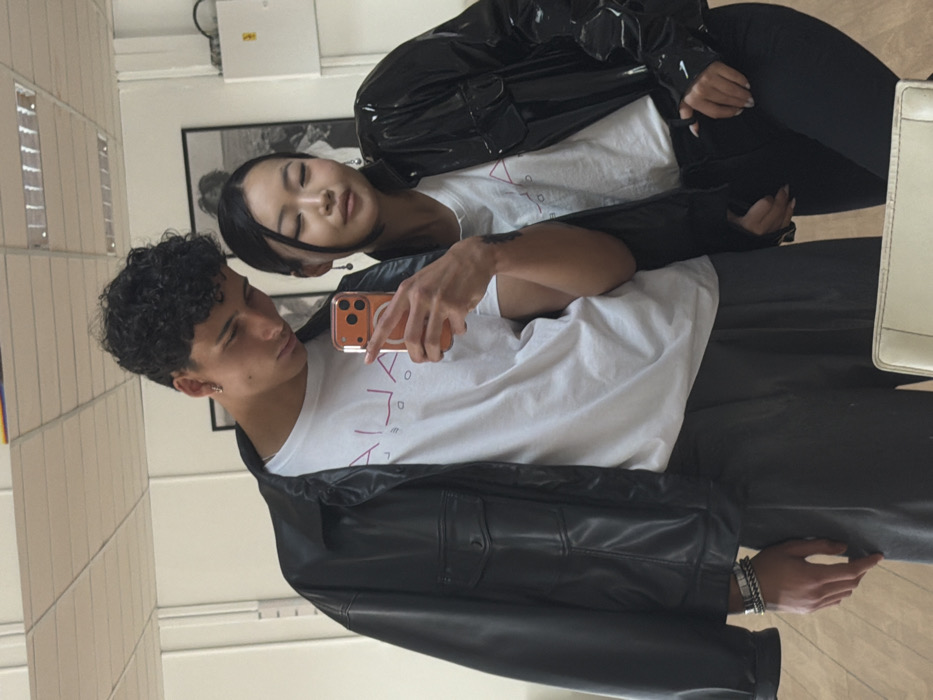 In the city of Varna, Bulgaria, a mirror selfie captures two individuals indoors. A male, approximately late teens to early twenties with dark, curly hair, stands on the left, looking down at an orange-cased smartphone with three visible camera lenses held in his right hand, which is actively taking the photograph. He wears a white t-shirt with reflected red text, an oversized open black faux leather jacket with two chest pockets, dark grey pleated trousers, a silver chain bracelet on his left wrist, and a small gold hoop earring in his left ear. His left arm is linked with the right arm of a female, also appearing to be in her late teens to early twenties, with dark hair styled back and strands framing her face. She wears a white t-shirt with similar reflected red text, an open shiny black patent leather jacket with two chest pockets, and black trousers. She has silver drop earrings, and her eyes are partially closed. Her left hand rests near her waist. The background, reflected in the mirror, shows white walls, a light brown floor, a white ceiling with recessed lighting and vents, a framed black and white picture on the wall, and a white mounted box-like object to the right. A light-colored chair back is partially visible in the lower right foreground.