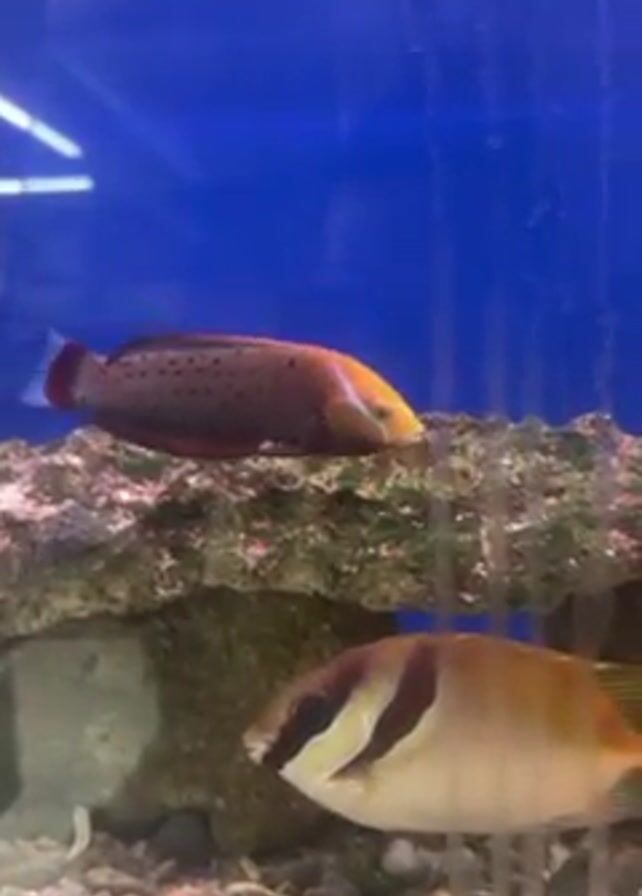 In an aquarium, two fish swim. One is brown with red spots and a yellow head. The other is tan with a black and white stripe on its face. They are swimming around rocks and coral. The aquarium has a blue background and a gravel bottom. Air bubbles rise through the water.