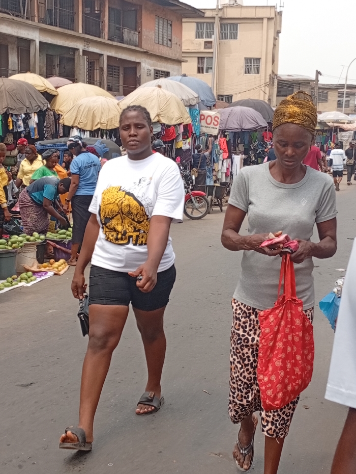 The image captures a bustling open-air market street scene in Onitsha, Nigeria. Two adult females are in the foreground, walking from left to right. The woman on the left wears a white short-sleeved t-shirt with a yellow graphic design, black shorts, and black slip-on sandals, carrying a small black handbag in her left hand. The woman on the right, appearing older, wears a grey short-sleeved t-shirt, leopard print capri pants, and flip-flops. Her head is wrapped in a golden, textured fabric. She holds small pink items in her right hand and a red fabric tote bag with a floral pattern in her left. The background is filled with numerous market stalls covered by various light-colored umbrellas and tarps, suggesting diverse merchandise including clothing. A red and white sign displaying "POS AVAILABLE HERE" is visible on a stall in the middle-ground. To the left, a stall exhibits green fruits, possibly mangoes or avocados, arranged on the ground. Several other individuals are present throughout the scene, engaged in market activities. A red motorcycle is parked near a stall further back. Multi-story, somewhat weathered buildings with balconies line the street under an overcast sky.