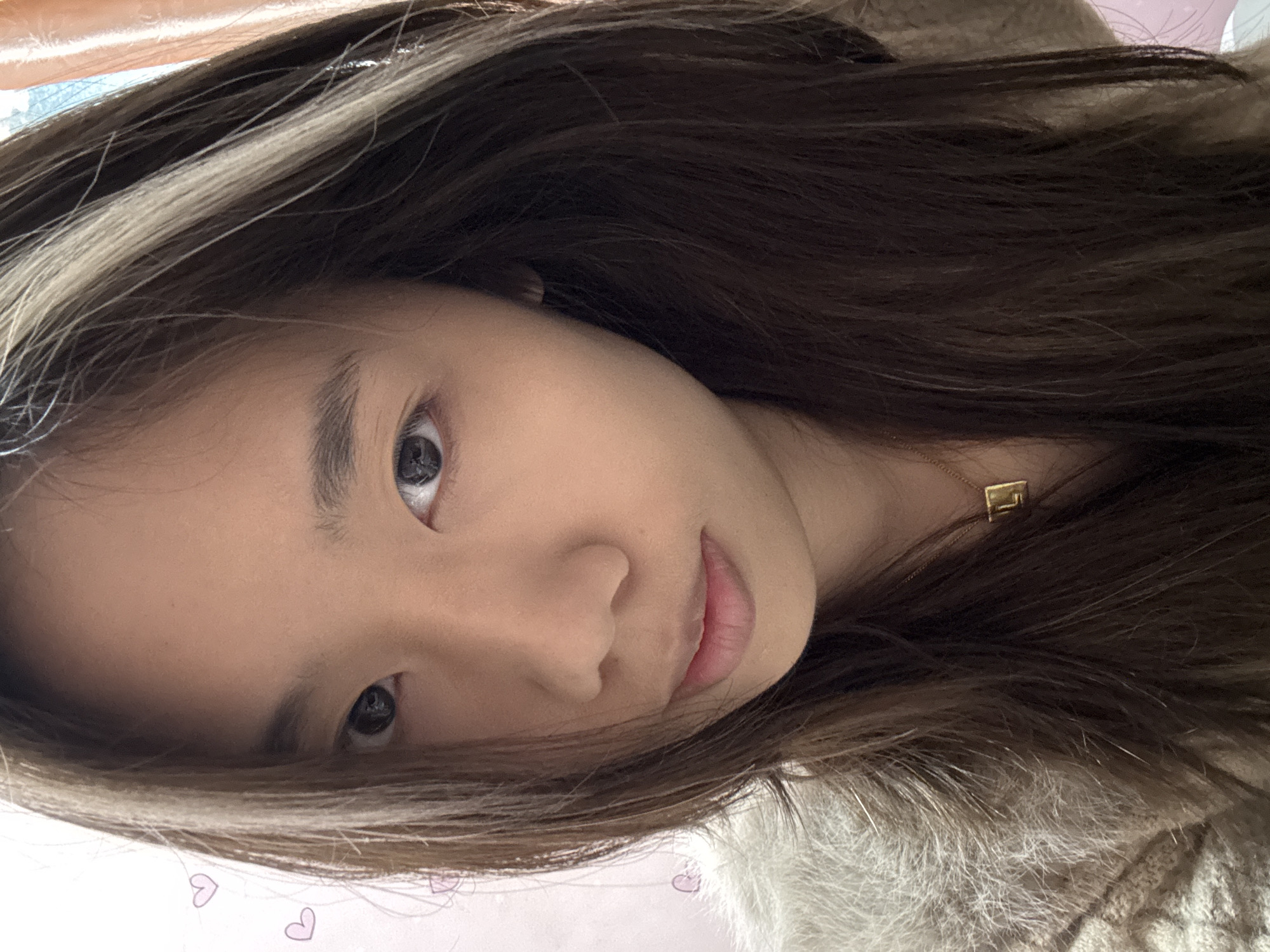 A portrait of an Asian female with brown hair and blonde highlights is presented. She is wearing a beige sweater and a gold necklace. The background features pink hearts. There is no indication of the location being Shapingba District, China.
