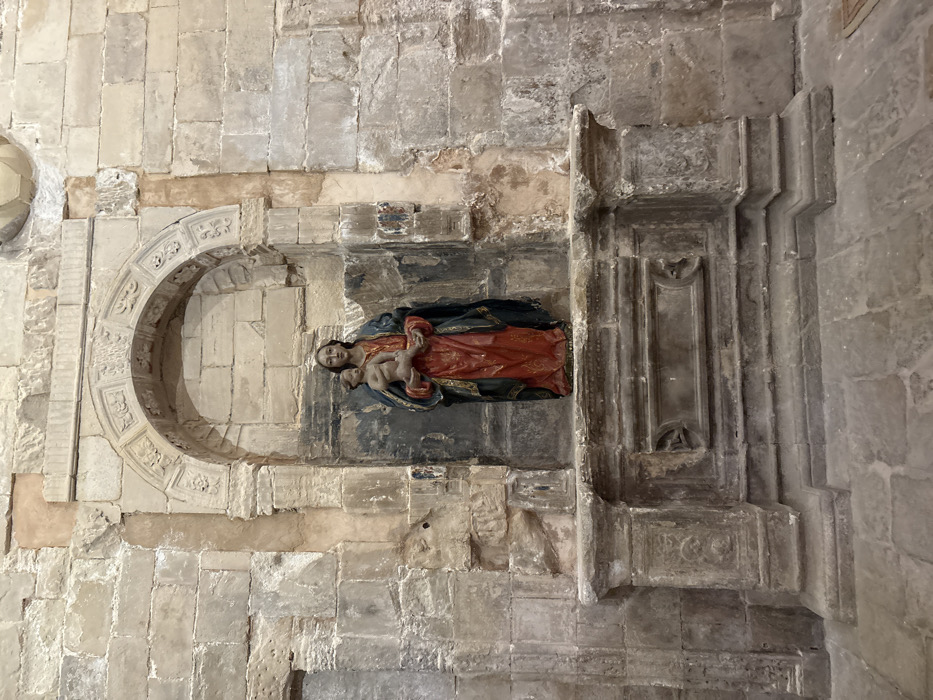 A polychrome statue of the Virgin Mary holding the Christ Child is centrally positioned within a carved stone niche, set into an aged stone wall in a historical building in Cuenca, Spain. The Virgin, depicted in a red gown and blue cloak, stands facing forward, supporting the unclothed infant Jesus with her left arm. Both figures exhibit serene expressions. The statue rests on a multi-tiered, carved stone pedestal. The niche features an intricately carved arch above the statue and is flanked by stone pilasters. The surrounding wall consists of irregularly shaped, light-brown stone blocks showing signs of wear and historical repairs. The floor is composed of similar stone blocks.