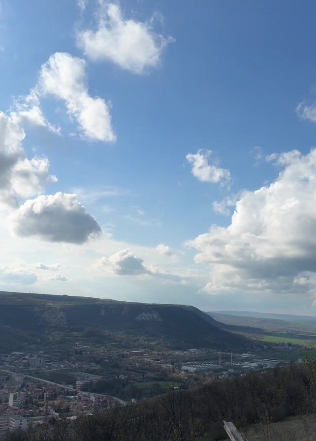 The video showcases a panoramic view of a town set against a backdrop of rolling hills under a sky scattered with white clouds. The camera slowly pans down from the bright sky filled with puffy clouds to reveal the cityscape nestled in a valley. The town appears densely populated with buildings, and the surrounding hills are green, indicating a temperate climate. In the foreground, some weathered wooden structures suggest a viewpoint or overlook location. The sky is the source of light, with the sun occasionally peeking through the clouds. The general atmosphere is one of tranquility, showcasing the natural beauty of the landscape and the integration of the town within it.