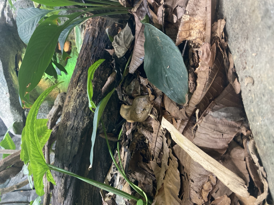 A camouflage snake rests amongst leaf litter, a tree trunk, and vibrant green plants