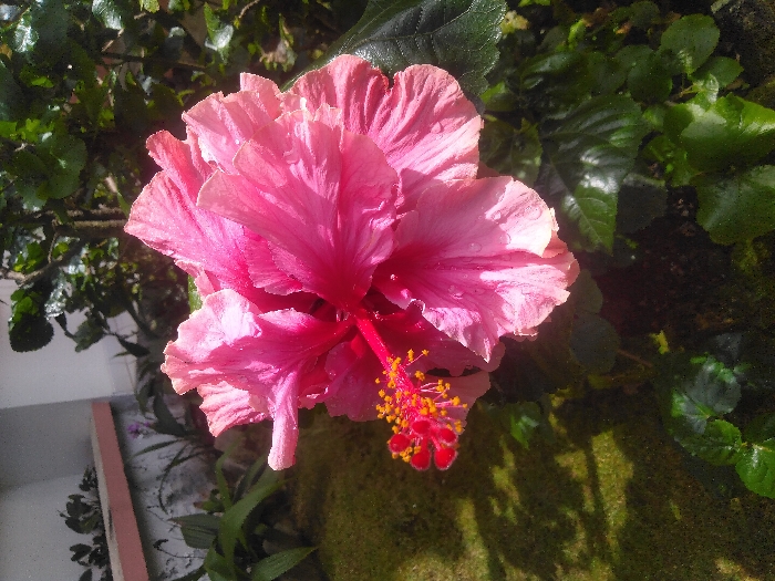 The image displays a vibrant pink hibiscus flower in full bloom, positioned in a garden setting in Cipanas, Indonesia. The flower, a dominant subject, features multiple ruffled petals, varying in shade from light pink to fuchsia, with small water droplets visible on their surfaces. A prominent red staminal column projects from the flower's center, capped with bright orange-yellow anthers. The immediate foreground and surrounding mid-ground consist of dense green foliage and areas of moss-covered ground, with some leaves exhibiting wetness. In the upper left background, a light-colored building wall with a raised horizontal ledge or planter is partially visible, supporting smaller green plants. The scene is illuminated by strong natural light, creating highlights on the flower and foliage. No individuals or specific actions are depicted within the frame.